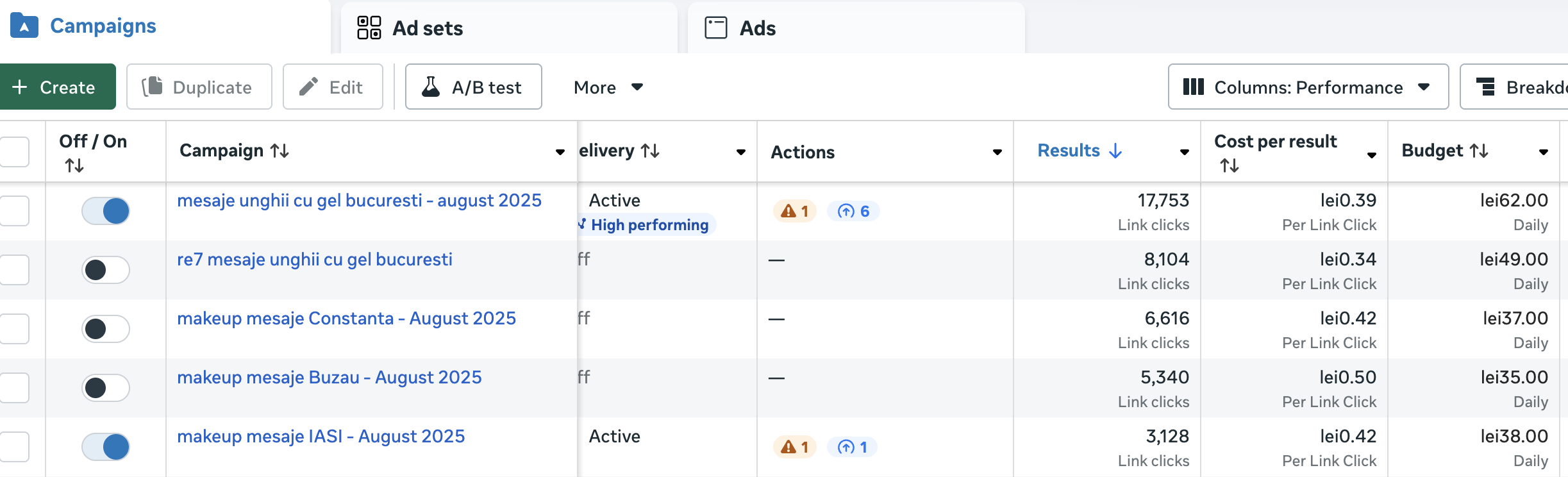 Strategia mea a fost să segmentez campaniile pe fiecare oraș în parte. Am creat o campanie pentru fiecare oraș și serviciu, testând creative simple, dar de impact. Apoi am scalat doar pe cele care au performat cel mai bine – astfel am optimizat bugetul și am crescut rezultatele.
