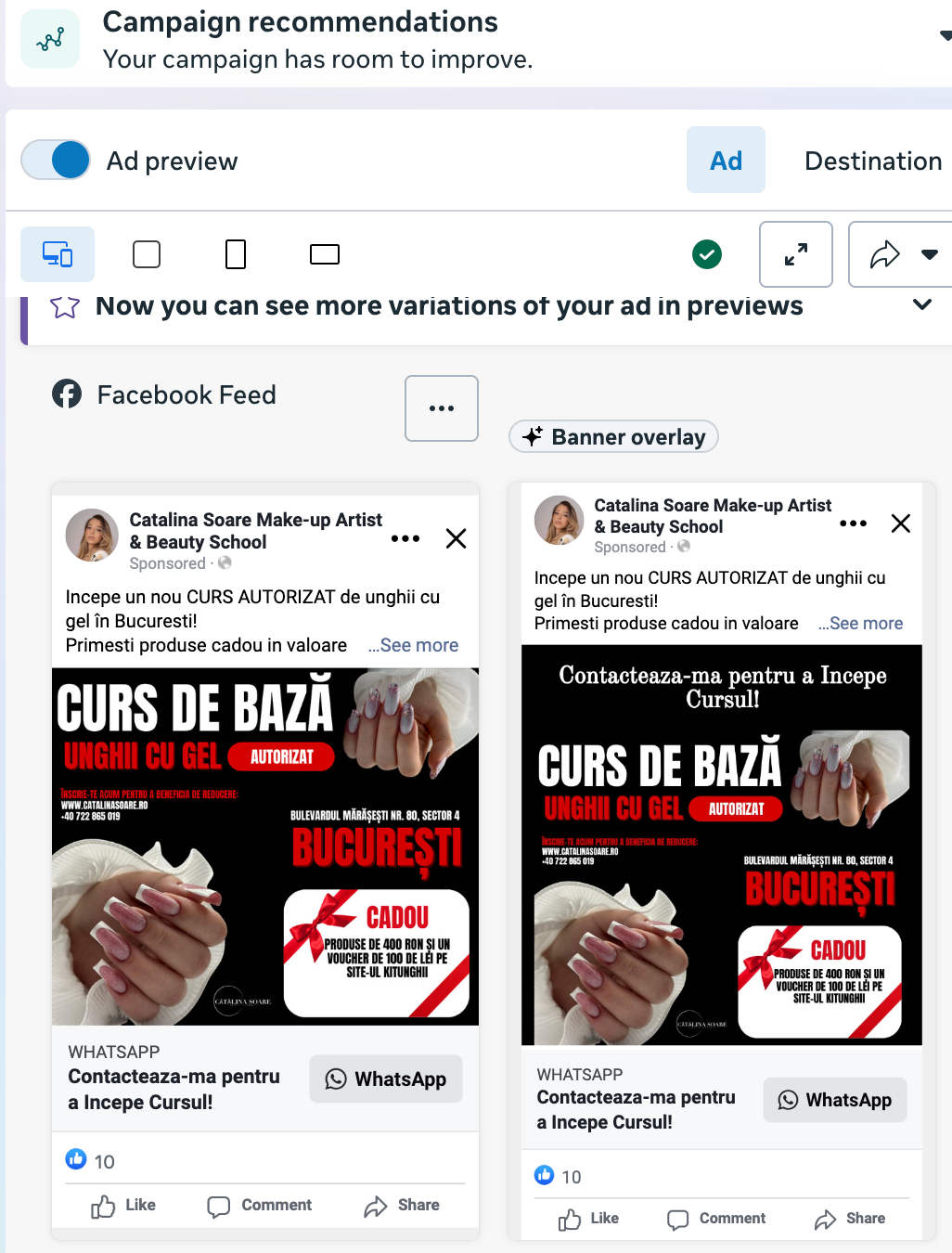 Pentru site-ul www.catalinasoare.ro, cu un buget maxim de 50 lei pe zi, am reușit să dublezi numărul de programări și înscrieri la cursuri.