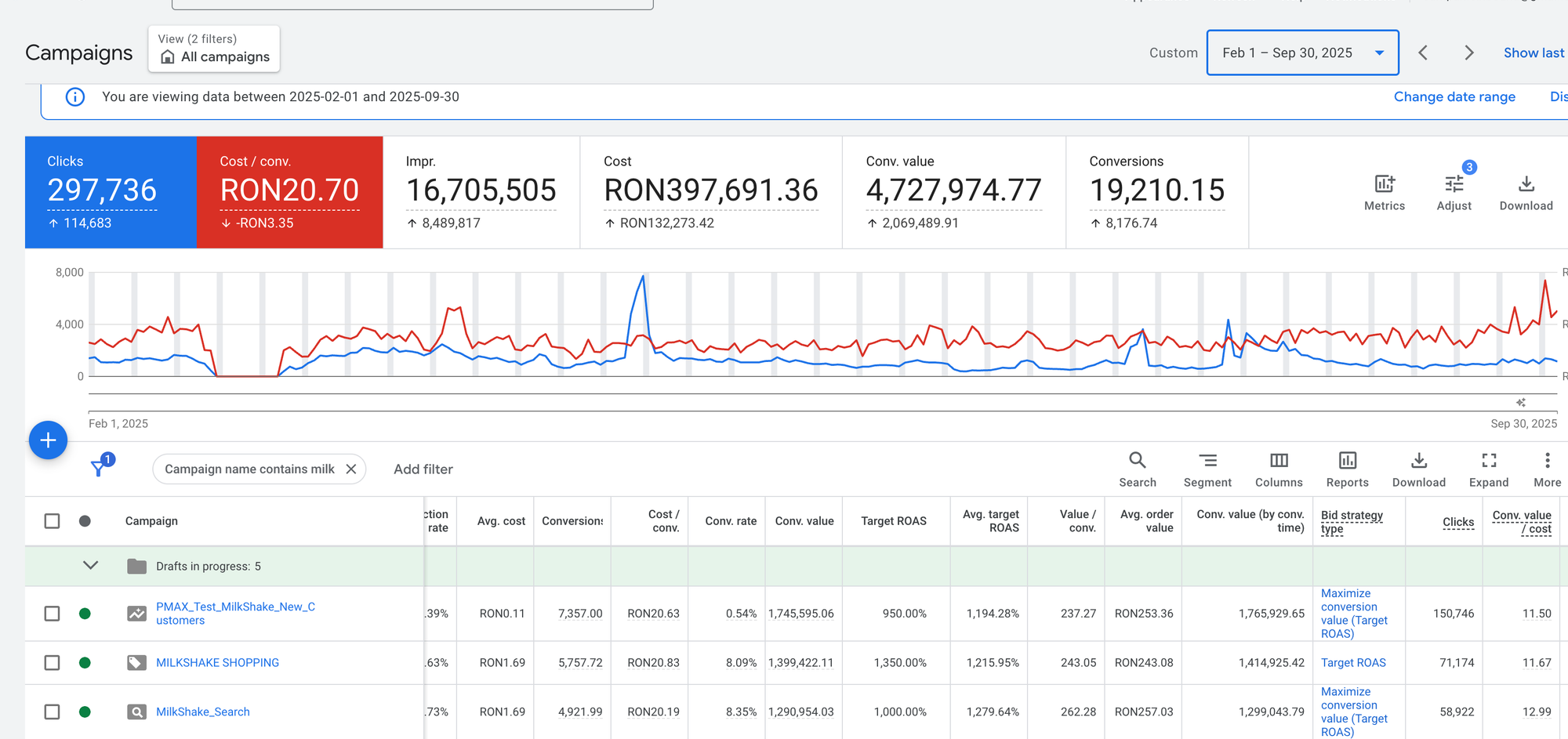 Ulterior, am folosit scalare prin TikTok Ads și Instagram Ads, obținând o expunere masivă și un engagement autentic din partea comunității. După consolidarea brandului pe social media, am integrat Milk Shake într-o campanie Performance Max (PMAX) pe Google Ads, care a adus rezultate record.